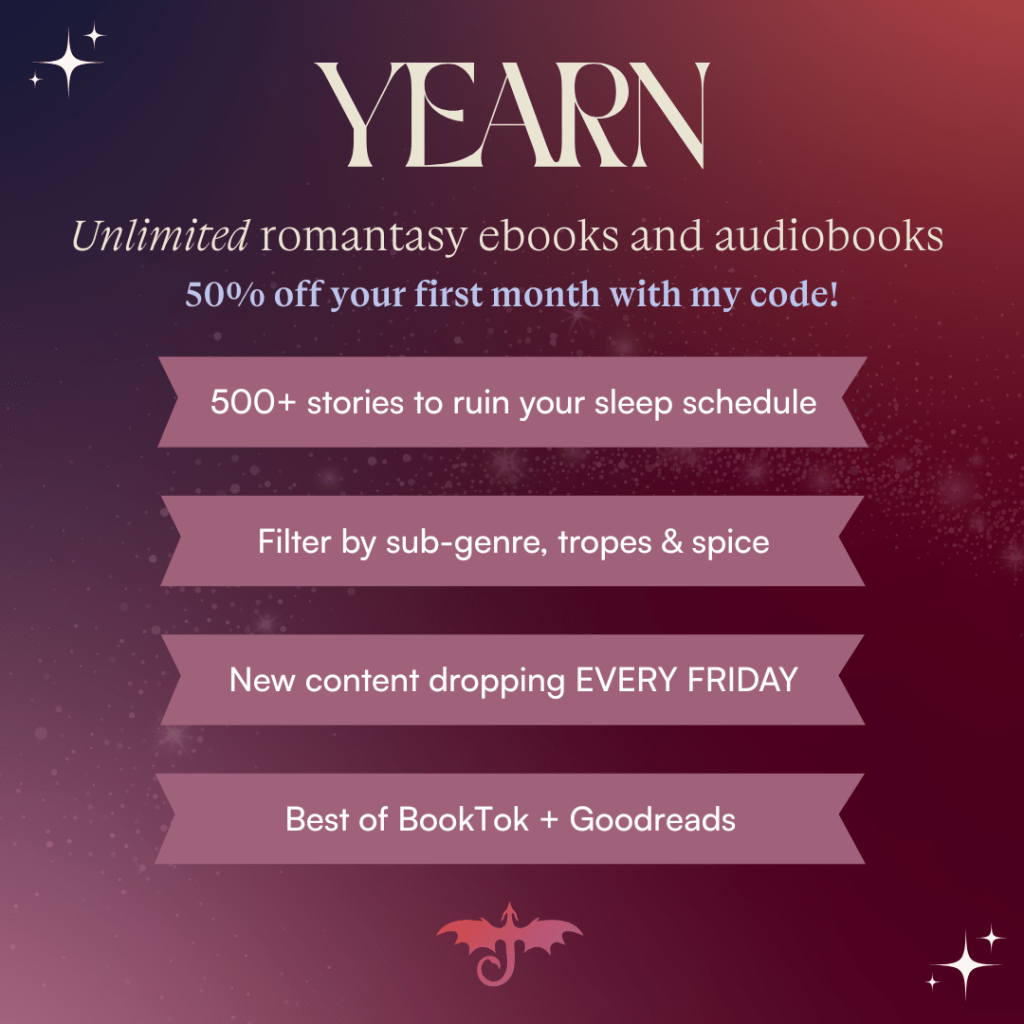 I’m so excited to announce a brand-new romantic fantasy platform that just launched this month! Yearn is woman-owned, backed by industry titans, and will give authors a platform to safely and fairly champion their books. It’s also got the best of your favorite bookish worlds: the diverse ebook platform of KU (without all the bots and unfair practices); the robust TBR/review space of Goodreads; and the joy and community of BookTok. You can find booklists organized like Spotify mood playlists, match with other readers who have similar book tastes, and, best of all, enjoy a POSITIVE, uplifting, joyful bookish space with no drama or politics – just books.